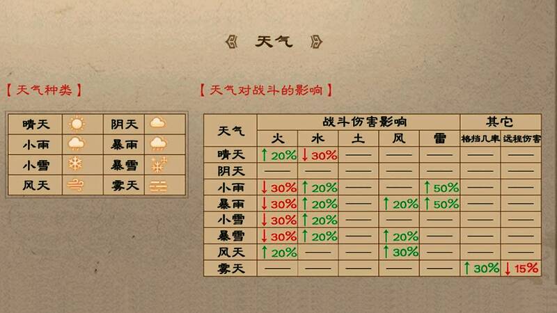 按关卡设定每回合战场天气会发生变化,战场天气会对武将的五行属性伤害产生直接影响。