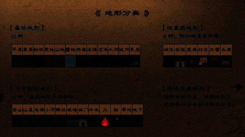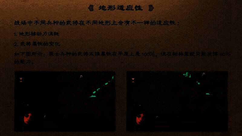 战斗场景中的地面是用格子拼接而成的,每个格子即代表1个地形(而非宏观意义上的渐变的地形),当武将站立在某个格子(即地形)上时,不仅会被格子影响属性,还会被格子影响其移动力。