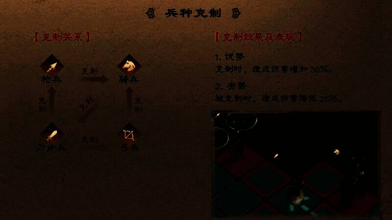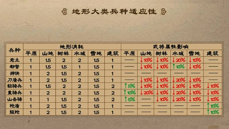 构成武将特性的元素之一,分步兵、枪兵、弓兵、骑兵四种基础类型,还有君主、策士、道士、医师、车兵、兽兵、女兵、弩兵、器械兵、运输兵、水兵、侠士等多种衍生兵种。兵种之间具有克制关系: