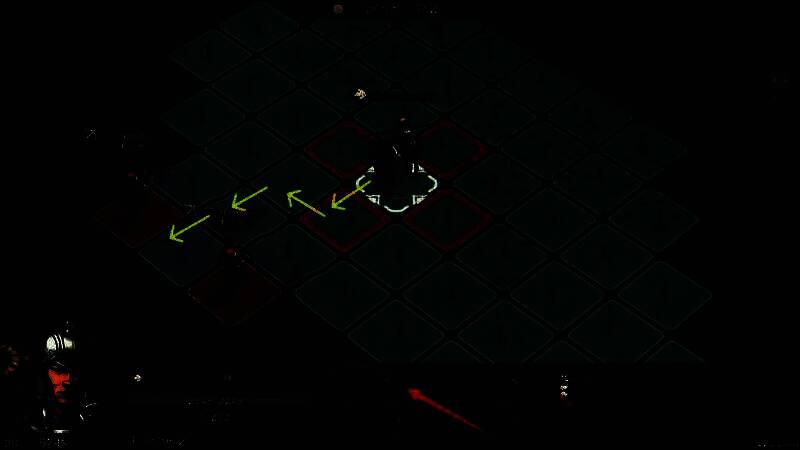 如下图,武将的行军路线中有敌军单位时,即便武将还剩1点移动力,也无法穿过敌军到达下一个格子。
