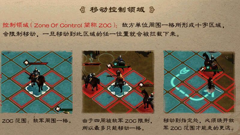 即控制领域(Zone of Control),指的是战场单位(不仅包含武将,还有建筑、阻挡物等)周围十字形的4个格子,当敌方单位进入自己的控制领域时,将被强行拦截下来,再多的移动力也无法通过。