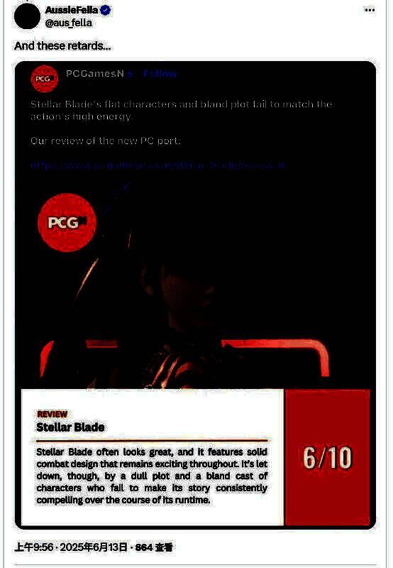 玩家又指出一个偏见媒体PCGamesN只给《剑星》PC版打了6分:
