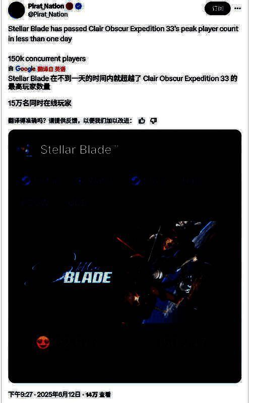 《剑星》只用了不到一天的时间,Steam在线峰值超过了《光与影:33号远征队》: