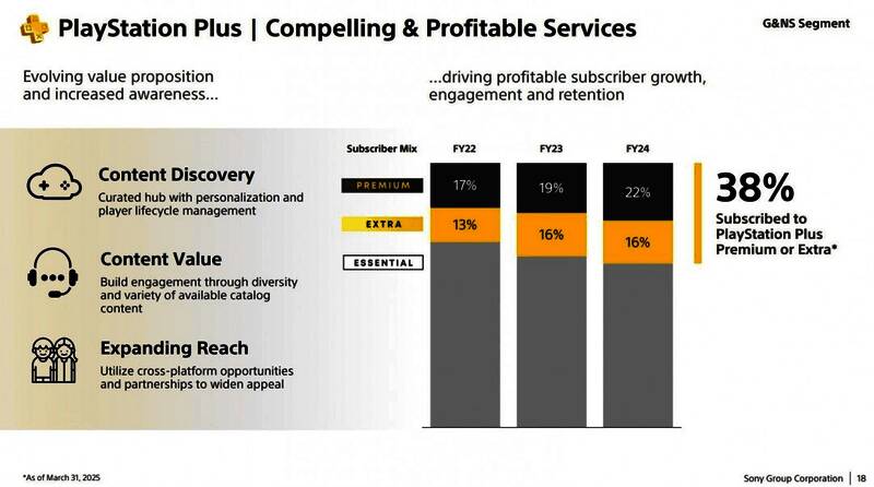 2024财年,月度活跃用户数增长14%,达1.24亿。尽管多数用户使用PS5,但PS4硬件仍保有极高人气。同期玩家游戏时长也同比增长,2024年累计游戏时间达510亿小时。此外,购买更高价位PS Plus Premium订阅的用户比例持续上升:2022财年占所有订阅者的17%,2023年升至19%,2024年达22%。而在付费订阅中,基础版(Essential)仍是最受欢迎的选项。