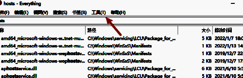 第一步:打开everything软件,进入到软件主界面,点击上方箭头所指的工具选项。