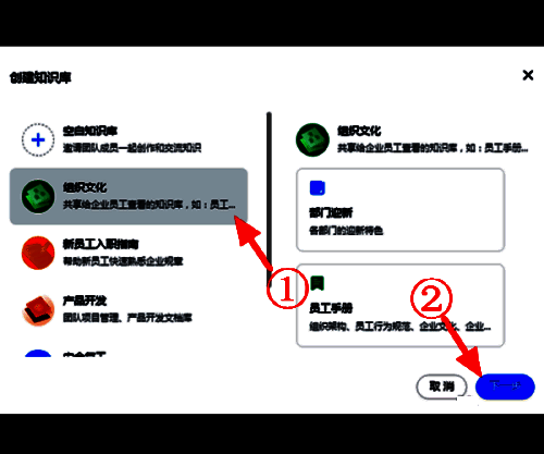 第四步:在创建知识库页面,以组织文化为例,点击组织文化,点击下一步;