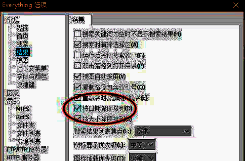 第四步:调出“选项”弹框,点击左侧“结果”按钮,点击勾选“按日期降序排序”选项(如图所示)。