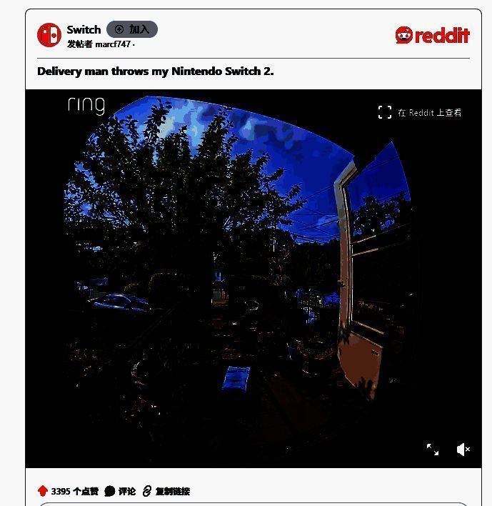 ·玩家展示了自己家的摄像头拍摄到的记录,心心念的Switch 2直接被扔在了门口,幸好拆包后除了外壳轻微损伤,内部还完好。