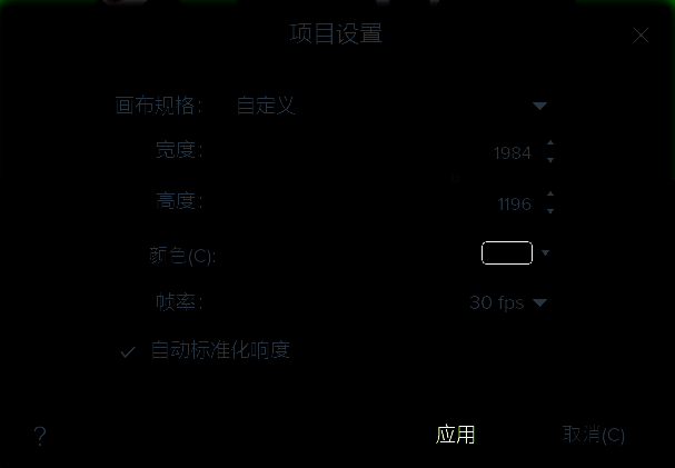 4.在项目设置中,可以对画布的规格进行调整。解除宽高比锁定,输入视频素材宽度和高度的数值,就可以实现画布的规格和视频尺寸相同。此外,在该菜单中,还可以对画布的颜色、帧率等其他参数进行修改。完成修改后,点击应用即可。