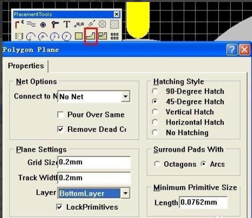 开始布线。原则是电源线尽量用粗线,信号线一般统一大小就可,如都用0.3mm或0.5mm之类的。我的习惯一般除了连IC脚的线,其它尽量用铺铜(电源板)。点击铺铜图标,在出现的对话框中设置好相应项,开始铺铜。把PCB板画板放大,能看到栅格,好画线对齐。