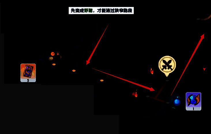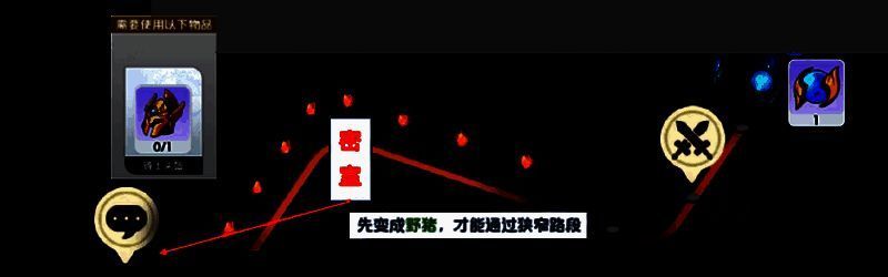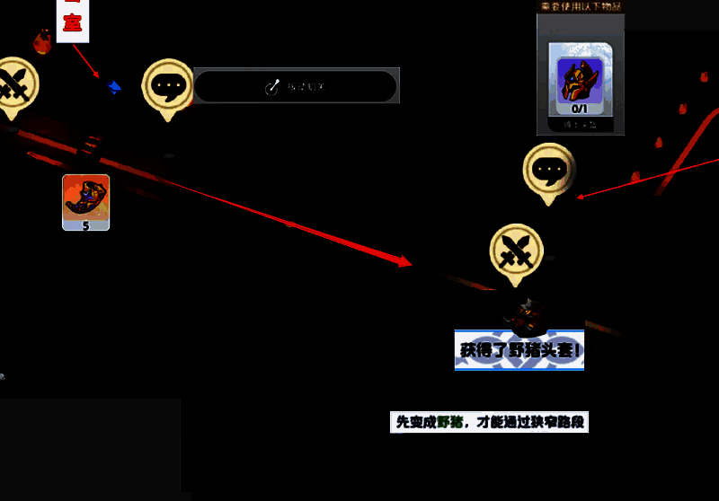 注:变猪可通过狭窄路段,但野猪弱小不能作战,进入战斗前记得变回人,否则无法进入战斗。