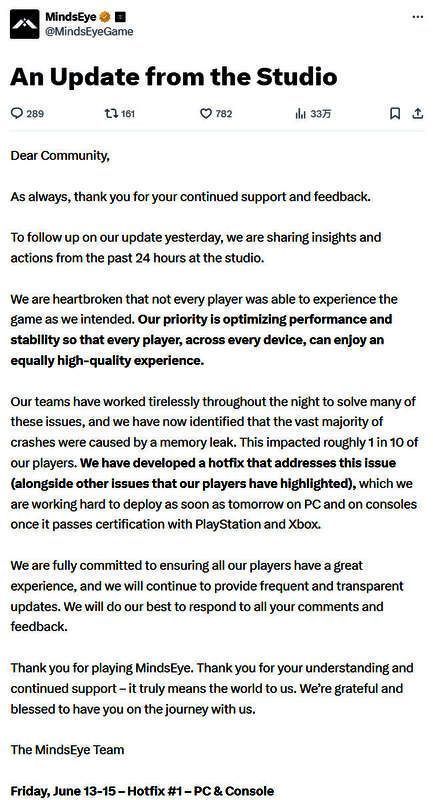 声明中写道:“我们致力于确保所有玩家都能拥有良好的游戏体验,并将持续提供频繁且透明的更新。我们会尽力回应你们的评论与反馈。感谢大家游玩《心之眼》,感谢你们的理解与持续支持——这对我们意义重大。能够与你们一起走这段旅程,我们感到无比感激和幸运。”
