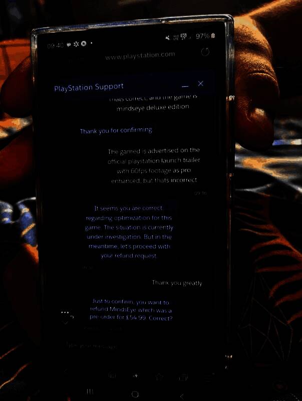 Reddit上有玩家po出了PlayStation的退款截图,这名玩家发帖说,PlayStation客服很轻松地就给他们退款了,而且说他们已经了解到《心之眼》的游戏优化情况,正在调查中。这名玩家补充说PlayStation之前这么表态的唯一一个其他游戏就是《赛博朋克2077》,后者被下架停售了6个月。