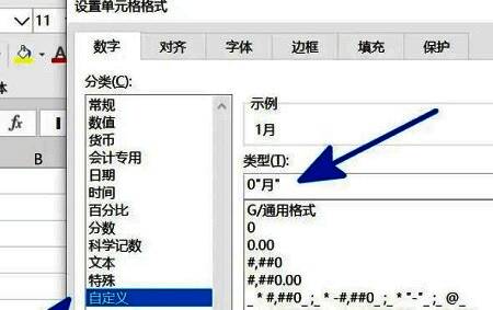 4、点击左侧的“自定义”然后在类型中选择0“月”,点击确定,如下图所示。