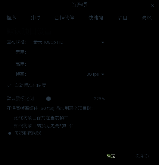 4.在首选项的项目菜单中,可以更改默认项目设置,进行视频帧率的调整。