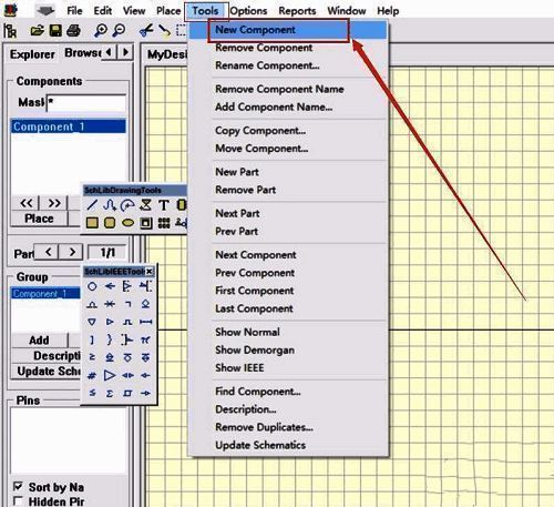 2.在菜单栏中选择“Tool”然后点击“New Component”,开始创建新的元器件。