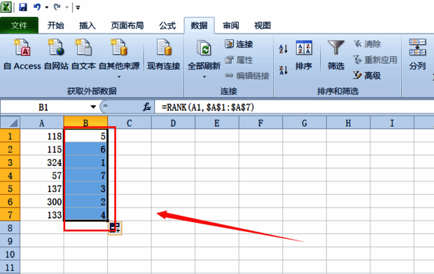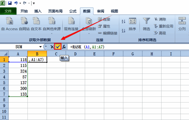 第二步:在B2单元格输入“=RANK(A1,A1:A7)”,点击上面的“√”(按回车键也可以),这是限定要使用函数的区间,可以得到该单元格的排名情况(如图所示)。