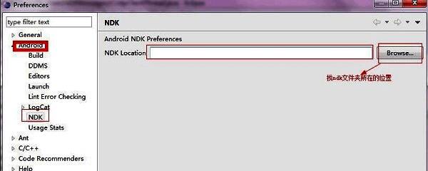 首先,打开eclipse,点Window->Preferences->Android->NDK,设置NDK路径。
