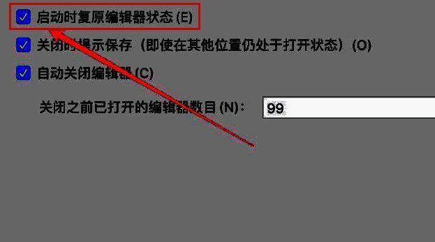 3.接着,下拉找到启动时复原编辑器状态选项,鼠标点击取消勾选即可