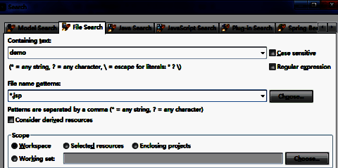 然后我们找到第二个File Search在这里可以选择你要全局查找的文件的类型,输入要查找到的内容即可,如图为例就是查找在所有的jsp中有“联系电话”这个词语的。
