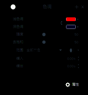 2、添加该视频效果后,可以在右侧的设置中对色调的相关参数进行修改。例如,更改浅色调、深色调的颜色,为颜色设置强度和去饱和度等,还可以调节色调缓入和缓出的时间。
