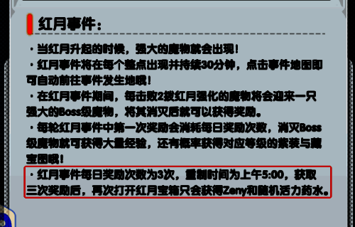 红月事件:这个活动每个整点开启,就是说11点 12点这样,活动开了后从“玩法”—“红月事件”点进去后可以看到红月事件发生在哪个地图,点击这个地图就可以直接过去参加