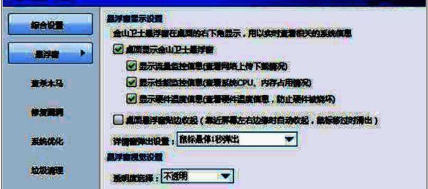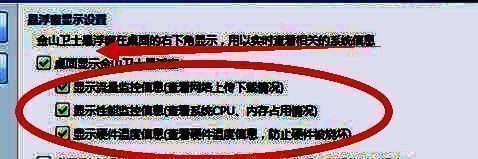 将“桌面显示金山卫士悬浮窗”给勾选后并且将子选项中你需要进行查看的内容一并勾选。