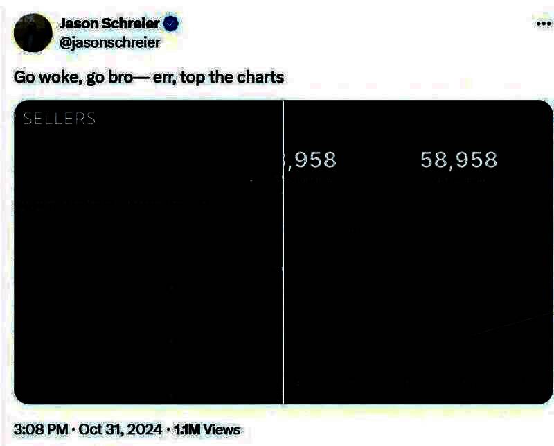 值得一提的是,彭博社记者Jason Schreier曾公然挑衅玩家群体中广为流传的一段话“Go Woke,go Broke”,随后被冰冷的现实打脸,不知道他在写这篇文章时有没有想过自己之前的推文。