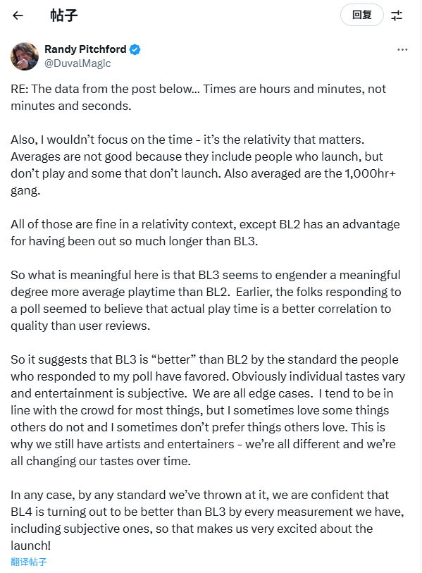 这番表态是对其早前发布的《无主之地》系列玩家游戏时长数据的回应。根据他公布的数据,《无主之地2》平均游戏时长约13小时42分钟,超87%玩家游戏时间超过1小时;而《无主之地3》平均时长达到18小时48分钟,92%玩家体验超1小时。Pitchford写道:"数据显示《无主之地3》相较前作能激发更长的平均游戏时长,此前参与投票的网友普遍认为实际游戏时长比用户评分更能反映游戏品质。"