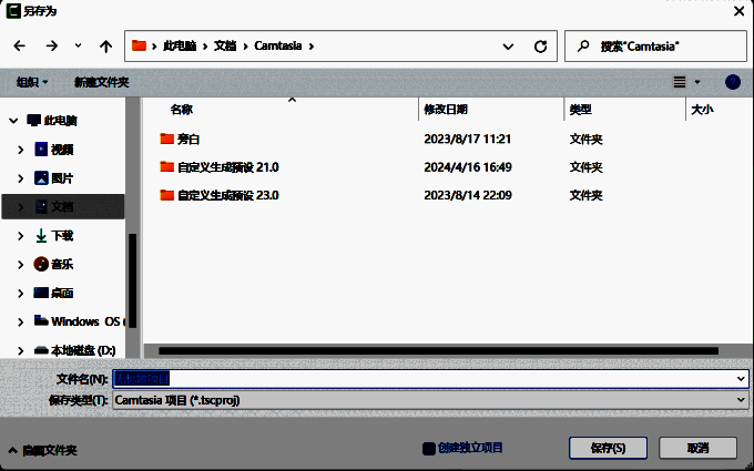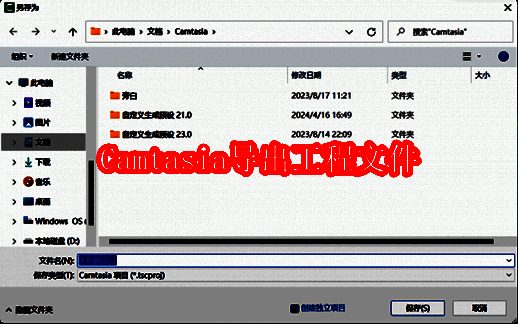 2.选择合适的文件夹路径,将工程文件保存在电脑中。需要注意的是,工程文件是以“.tscproj”的格式进行保存的,如果使用Camtasia以外的其他视频编辑软件打开,可能会导致文件打开错误,无法正常使用。