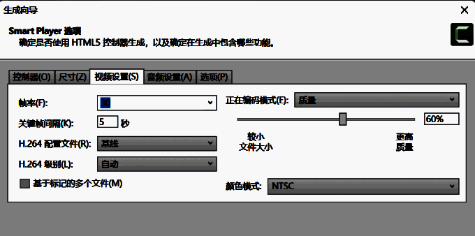 2.在自定义生成设置的smart player选项中,找到视频设置,在这里可以更改视频的帧率和编码模式。帧率越高,画面也就越流畅。拖动编码模式下方的滑块,可以决定最终导出的视频需要更高的质量还是较小的文件大小。