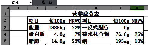 3、另外一种方法则是可以在Excel表格中事先制作好需要的营养成分表之类的表,然后直接复制表格粘贴到BarTender模板中,调整位置即可。需要注意的是,小伙伴们要明确字体大小,避免复制到BarTender模板上的表格模糊不清,导致打印失败。