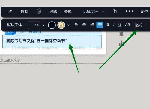 第三步:接着使用左侧样式进行排版或者输入文字,选中需要插入符号的地方,将光标放到此处,点击【格式】。