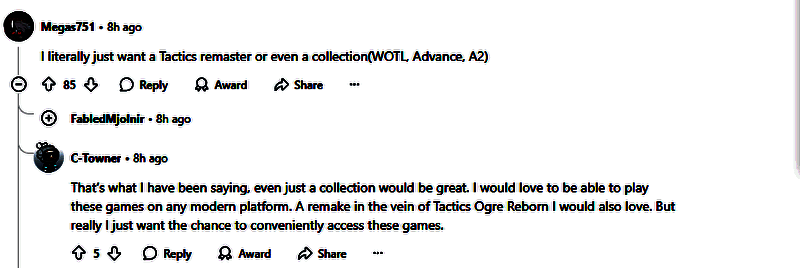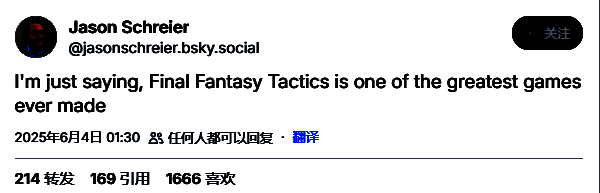 值得注意的是,彭博社记者Jason Schreier今年曾在Reddit隐晦提及"《最终幻想战略版》重制版确有其事",近日他又开始发布相关暗示。他在社交媒体BlueSky上表示:“我只是想说,《最终幻想战略版》是有史以来最伟大的游戏之一。”