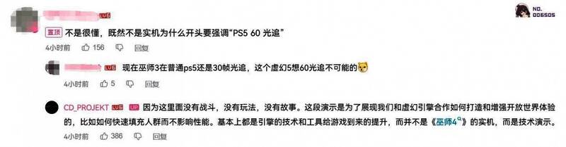 《巫师4》技术演示展示了了MetaHuman和Nanite Foliage等技术,在视频开头还强调了“PS5 60 光追”,这也引发了玩家好奇。CDPR置顶并回应了这条评论。