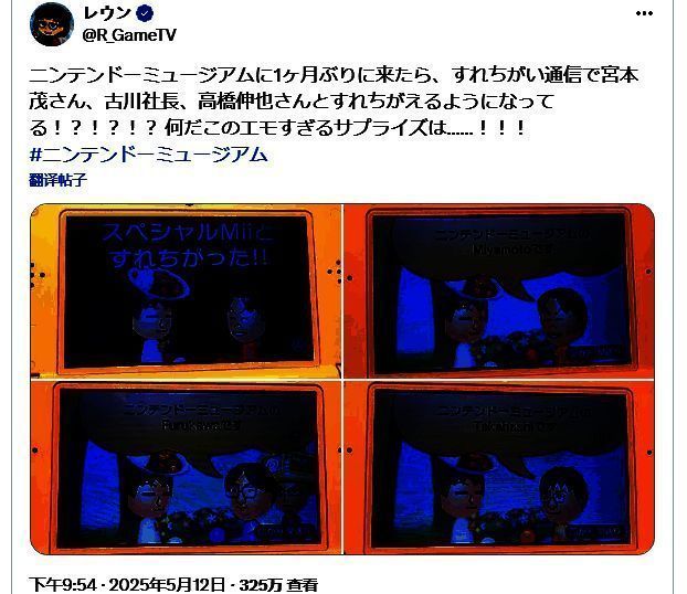 虽然任天堂官方已经停止支持3DS,不过仍有大量忠实玩家,日前一位日本玩家参观任天堂博物馆,携带着3DS尝试了擦肩通信,没想到竟然遇上宫本茂还有任天堂社长等传奇大佬的Mii。