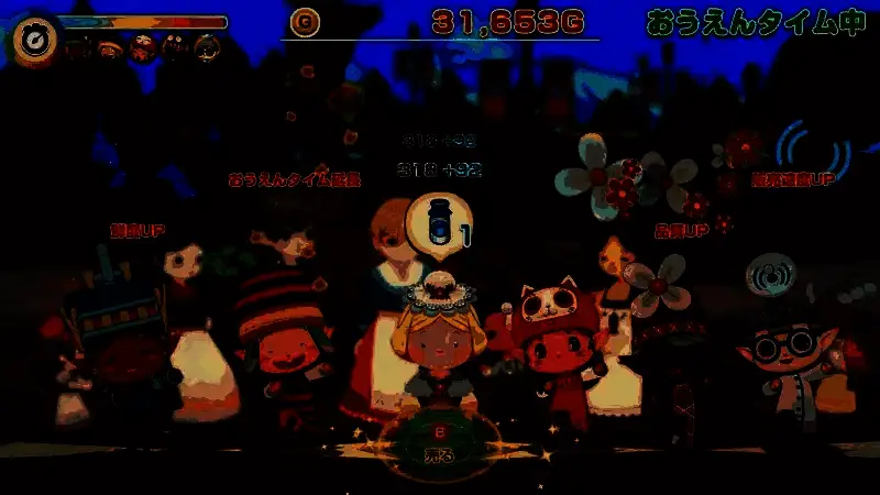 在集市中成功销售大量商品,并让顾客感到满意时,画面右上方的“声援槽”将会逐渐累积。当量表累积到一定程度时,按下指定按钮,即可触发神秘妖精“小矮人族”的“声援时间”。