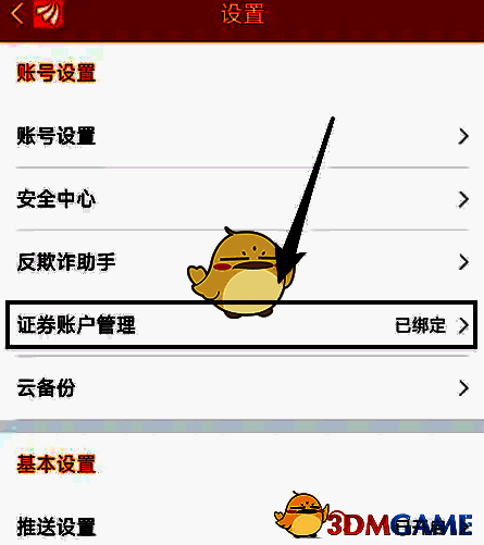 3、在设置界面,点击【证券账户管理 已绑定】所在行。