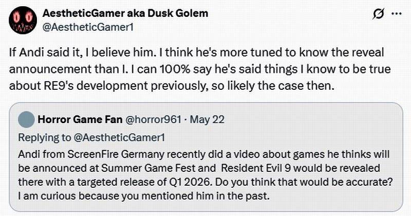 近日游戏博主ScreenFireGermany爆料称,卡普空计划在2026年第一季度发布《生化危机9》,这意味着游戏将在明年1月-3月底期间推出。本作还将在今年夏日游戏节上正式亮相。