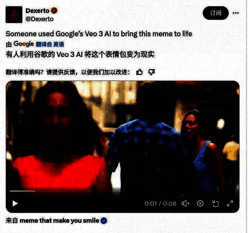 谷歌最新AI工具Veo 3让火爆全球的“走神男友”热梗成真,原本是一张静态图片,现在变成了“真人互动视频”。通过AI的力量,画面中的人物仿佛活了过来,展现出极为逼真的表情和肢体动作。