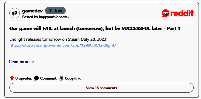 ·「r/gamedev」subreddit网友是一位独立游戏开发者,根据其近期的表现看来或许入错了行,更应该去做数据分析师的工作,他开发的游戏《Endlight》于2023年7月发布,本人表示当初发布前就已经做好了失败的心理准备。