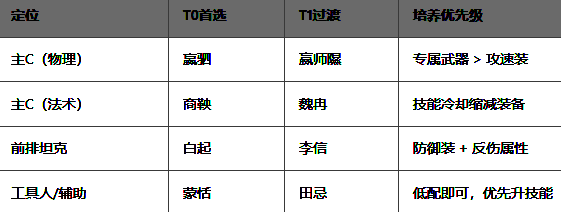 嬴荡:T0重装战士,普攻驱散负面状态并回怒(20怒/10S),60%物理增伤配合护盾(120%)抗压,优先攻击敌方脆皮。