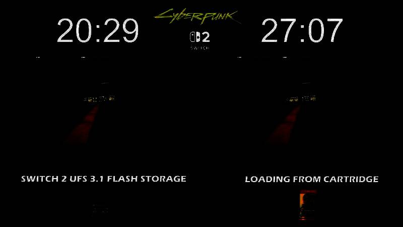 此外,油管频道SuperMetalDave64X还测试了第三方游戏《赛博朋克2077:终极版》在Switch 2上的加载速度:内置闪存 vs 卡带,结果显示Switch 2内置的UFS 3.1闪存比卡带快了将近7分钟。