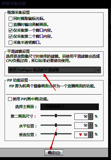 第七步:选中使用PotPlayer低品质平滑滤镜选项之后,点击确定(如图所示)。