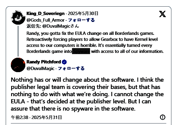 ·Take-Two官方回应称新的EULA规则并不是仅仅限于《无主之地2》一款游戏,而是对应旗下的所有游戏,而且Take-Two绝不会使用间谍软件,关于公司在收合法化集玩家信息的质疑,新规则只是标示了可能会收集信息而已,而不是确定会收集,而且即使要收集信息也会遵守法律约束以及为了游戏游玩的必要性。