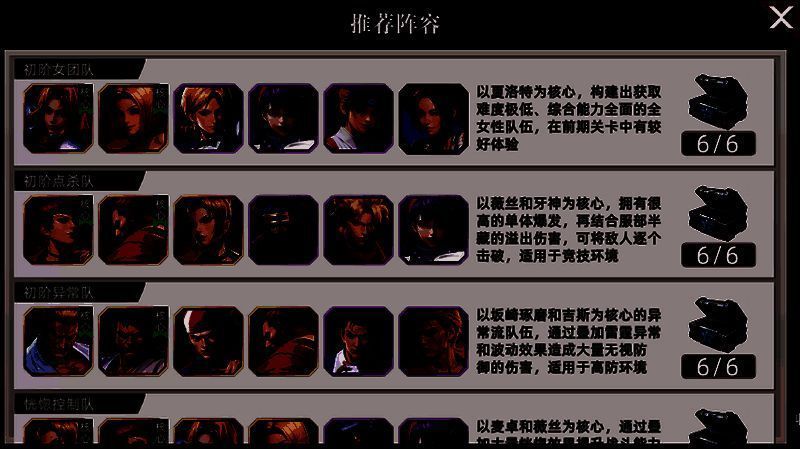 游戏中给玩家们一共推荐了十多种阵容搭配,在游戏初期,建议无脑选择 “初阶女团队”。这个队伍由获取难度低、升星速度快的英雄组成,而且英雄之间的羁绊能够全部激活,在前期的关卡战斗中,能展现出出色的战斗力,帮助玩家顺利通过前期关卡,积累资源。