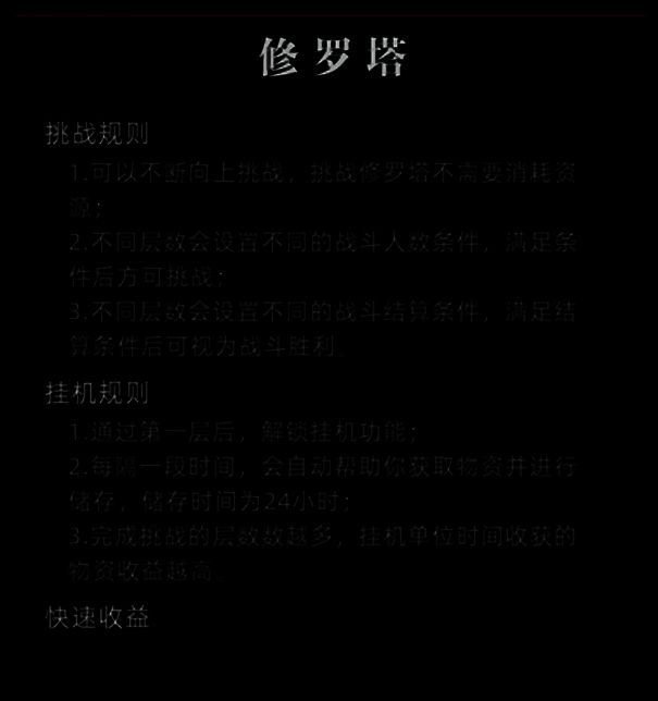 修罗塔主要产出装备精练、装备增幅所需要的各种材料,当玩家成功通过修罗塔第一层后,即可解锁挂机功能。这一功能十分实用,每隔一段时间,系统会自动帮助玩家获取物资并储存,储存时间为 24 小时。而且,完成挑战的层数越多,挂机单位时间收获的物资收益越高。