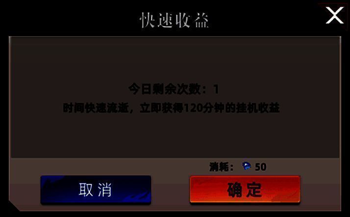 为了让玩家能更高效获取挂机物资,游戏还提供了快速收益功能。玩家可使用该功能,迅速获得 120 分钟的挂机物资收益。这在玩家急需资源提升角色,又没时间长时间等待挂机时,是个绝佳选择。