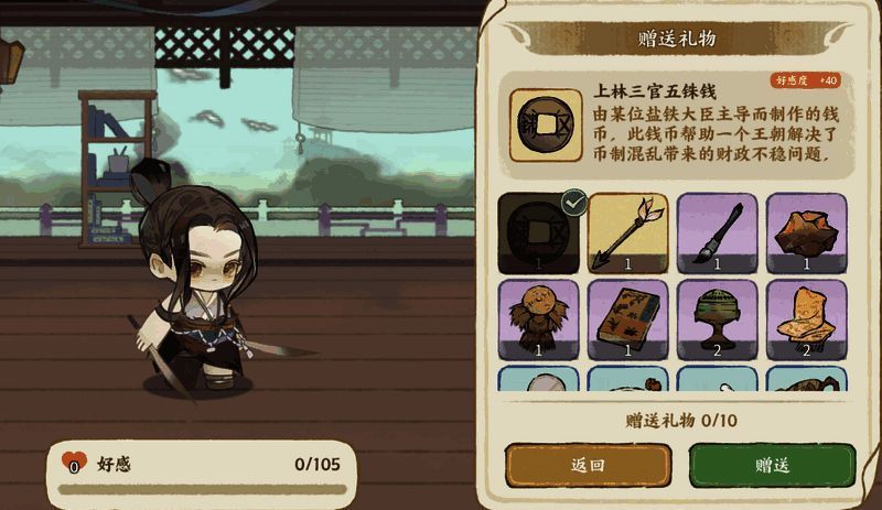 应龙小提示: 投其所好是关键!部分礼物对特定名士有“特攻效果”,会带来额外的好感度加成哦!(嘘… 多观察名士的喜好小秘密吧!)