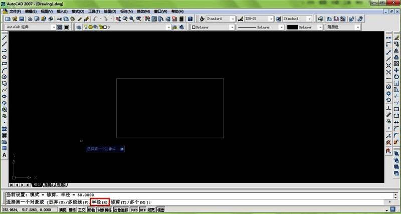 点击圆角功能键,此时在下方的命令栏里弹出选择第一个对象,在这里我们选择半径r,直接输入r,如下图所示。